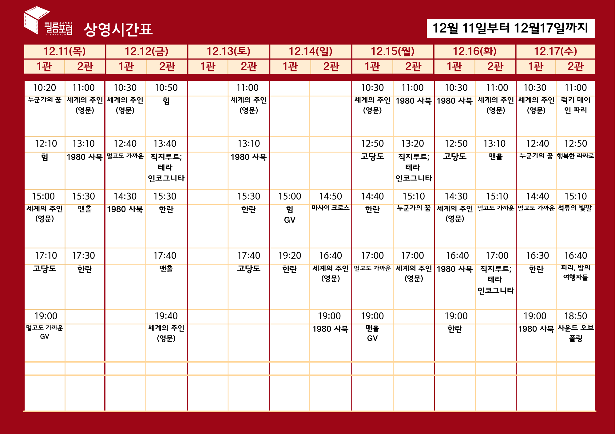 ![]() 필름포럼 12월11일(월) ~ 12월17일(수) 주간 상영안내